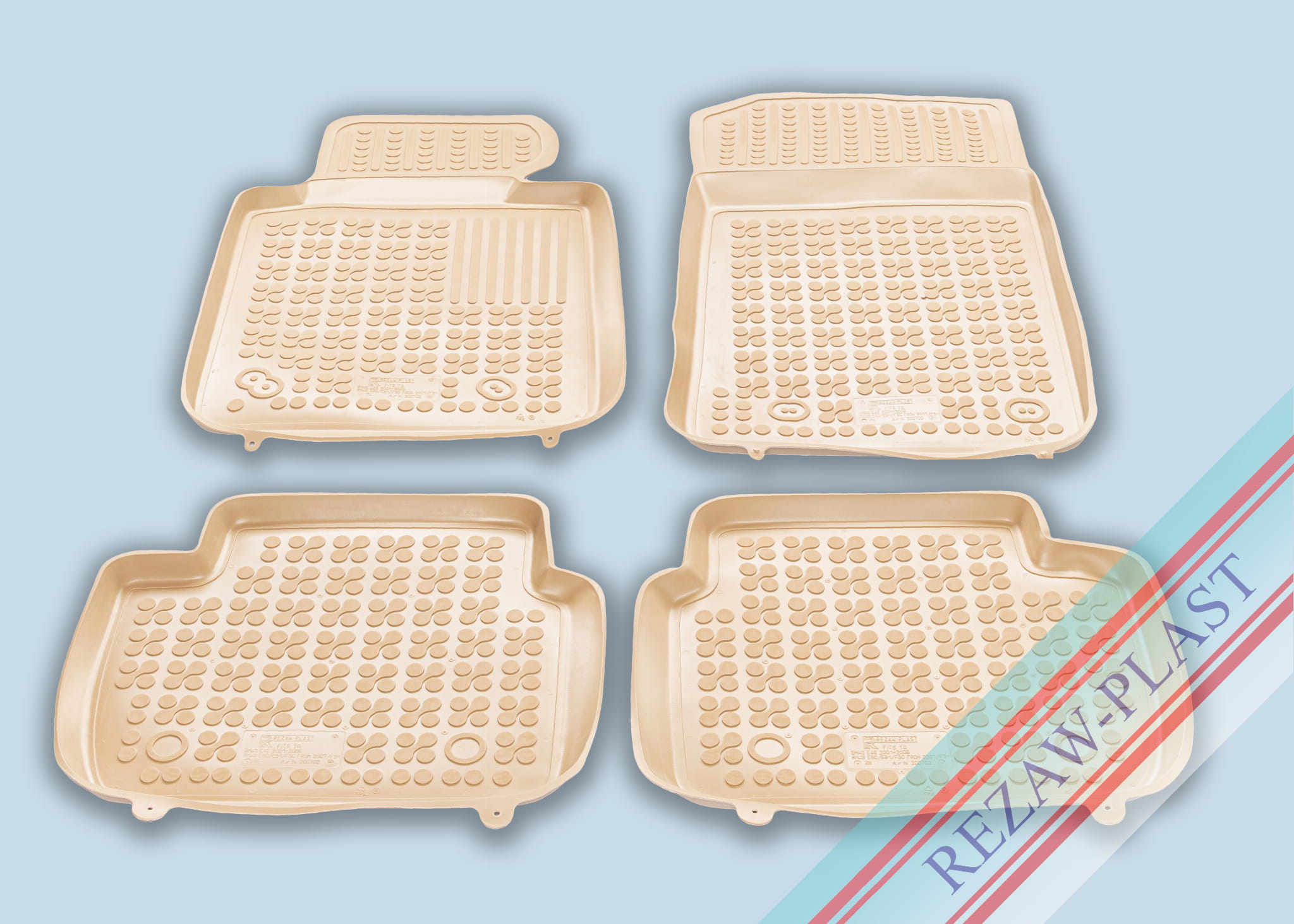 Komplet przeznaczony do pierwszego i drugiego rzędu siedzeń. Składa się z 4 sztuk i zawiera stopery do przednich dywaników. Można zakupić dodatkowo komplet stoperów do tylnych dywaników. Dywaniki dostępne również w innych kolorach: szary i czarny.