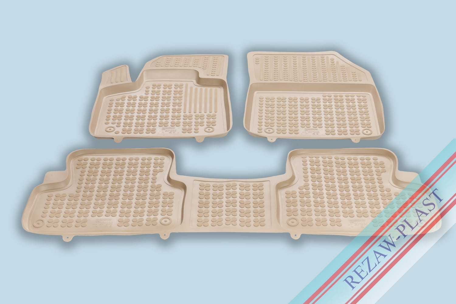 Komplet przeznaczony do pierwszego i drugiego rzędu siedzeń. Składa się z 3 sztuk i zawiera stopery do przednich dywaników. Można zakupić dodatkowo komplet stoperów do tylnych dywaników. Dywaniki dostępne również w innych kolorach: szary i czarny.