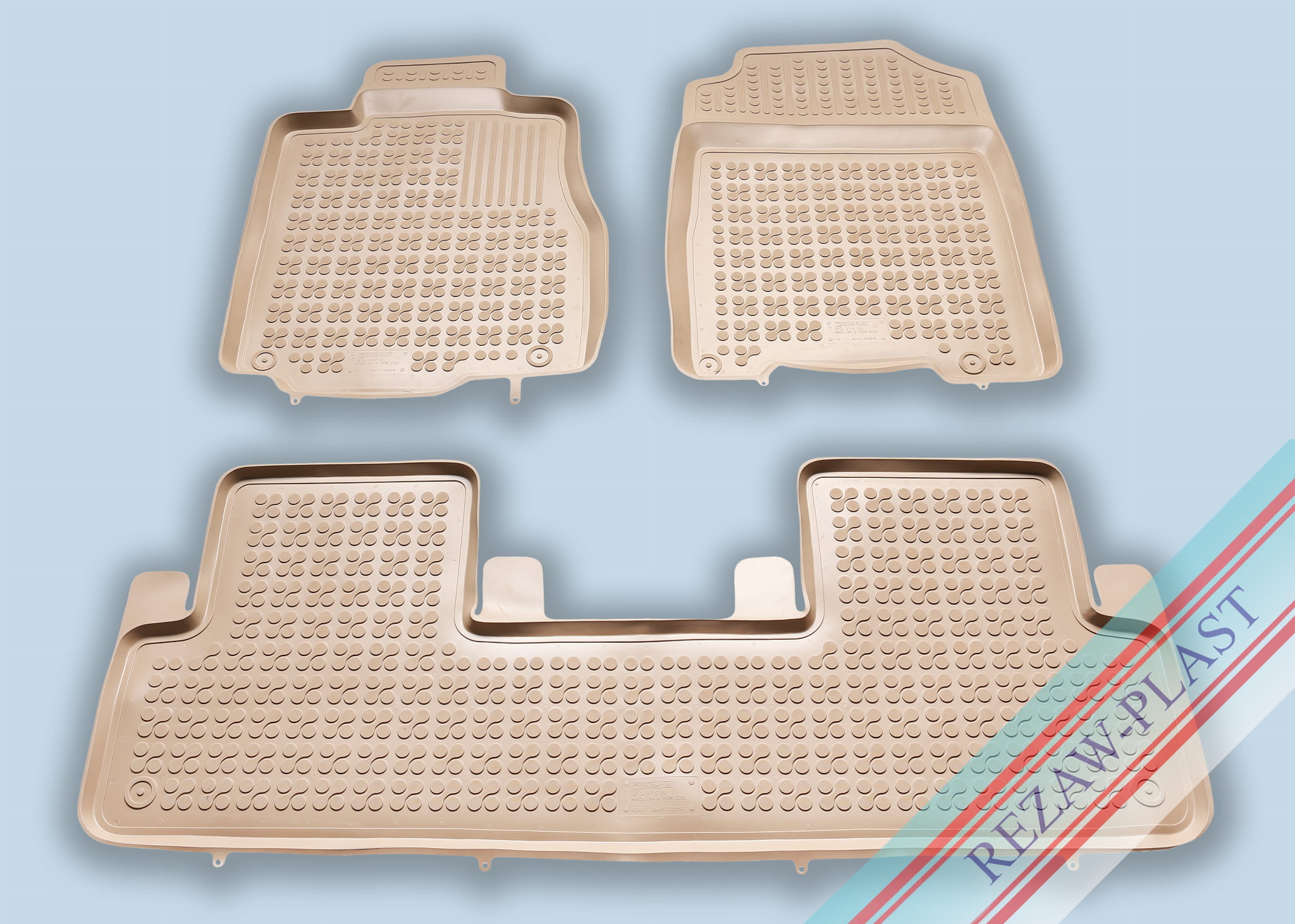 Komplet przeznaczony do pierwszego i drugiego rzędu siedzeń. Składa się z 3 sztuk i zawiera stopery do przednich dywaników. Można zakupić dodatkowo komplet stoperów do tylnych dywaników. Dywaniki dostępne również w innych kolorach: szary i czarny.