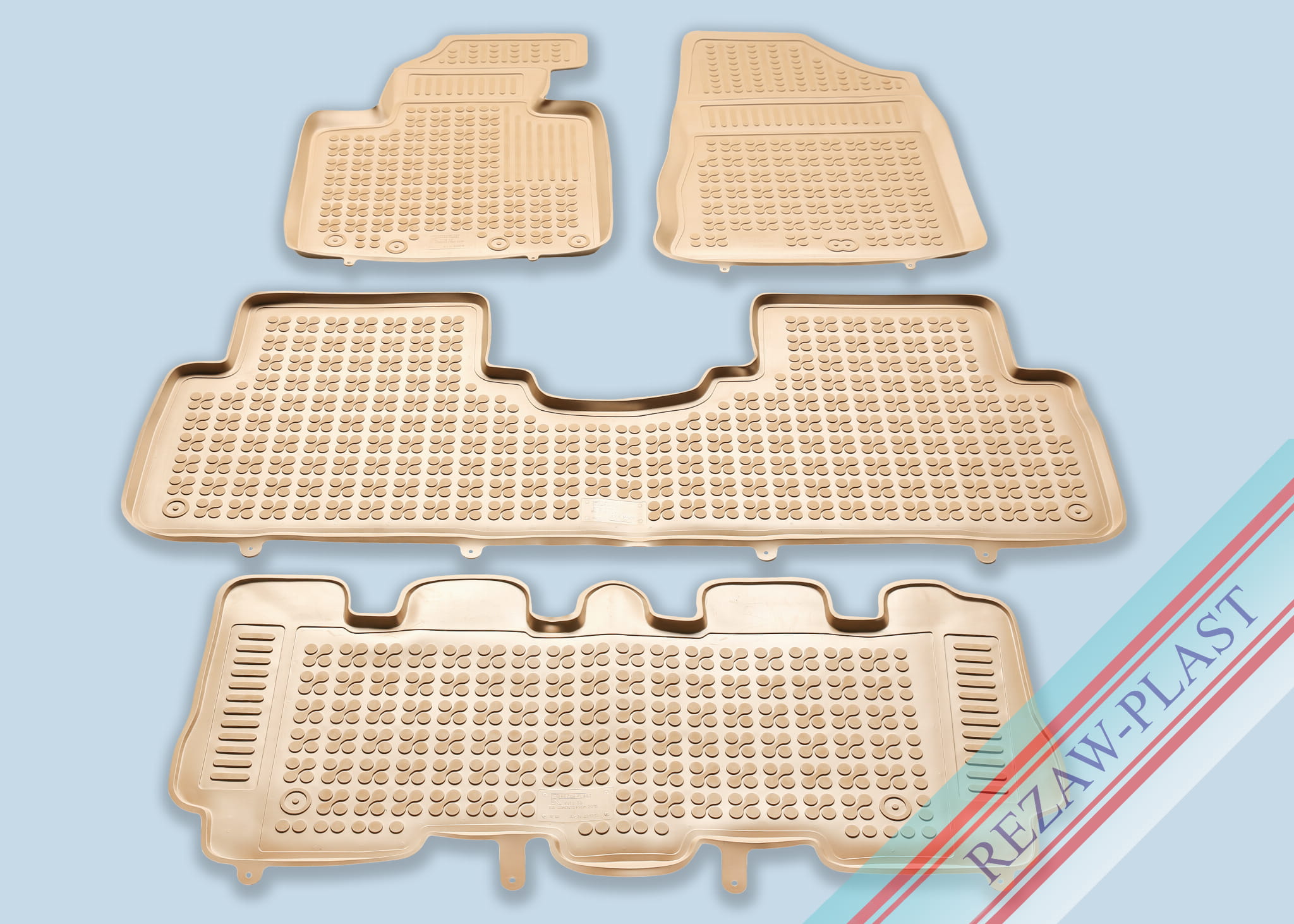 Komplet przeznaczony do pierwszego, drugiego i trzeciego rzędu siedzeń. Składa się z 4 sztuk i zawiera stopery do przednich dywaników. Można zakupić dodatkowo komplet stoperów do tylnych dywaników. Dywaniki dostępne również w innych kolorach: szary i czarny.